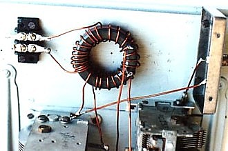 I arranged for the toroidal coil to have a similar primary inductance to the AR open coil unit and set the coil taps to provide the same ratio of turns. The secondary was also proportioned on the same basis. To achieve the same inductance (a little over 5 uH), 20 turns were placed on the primary and taps were connected at 14 and 10 turns. The secondary of six turns was interwound with the first six turns of the primary, commencing from the cold end.