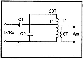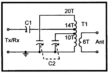 Considering the factors I have discussed, there are clearly reservations about the use of this type of coil design in the Z match on the higher HF bands and at high powers. However, it takes up a lot less space than the open coil and could be attractive to some of the QRP operators who use only low power on 3.5 and 7 MHz where high efficiency is achieved. It is interesting to observe that if only these two bands are to be used, only the top section of C2 is required and there is no need for the split stator tuning capacitor unit. In this case, the circuit can be simplified to the diagram of Figure 6. This makes a slight difference to the load range curves for 3.5 and 7 MHz, but the whole load range is still covered. The arrangement also just tunes to the edge of the 10 MHz band but, if this band is used, it might be desirable to drop off one turn from the top of the primary. With the coil turns reduced, a little more than the maximum specified capacitance of 260 pF for C2 might also be needed to still tune 3.5 MHz.