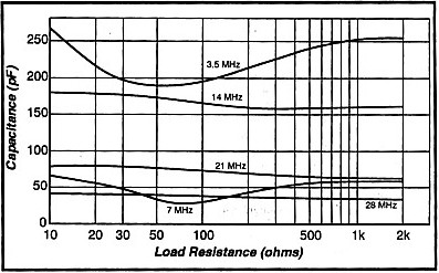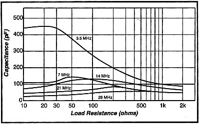 In testing the open coil AR Single Coil Z Match, load range tests were carried out over the resistance range of 10 to 2000 ohms at frequencies of 3.5, 7, 14, 21 and 28 MHz. The same tests were repeated using our toroidal core coil unit and this matched over the whole range, as did the open coil unit. Tuning curves, Figures 3 and 4 plot the capacitance needed in Cl and C2 over the load range. The curves show that the maximum capacitance for input capacitor Cl is 450 pF and for shunt capacitor C2 is 260 pF.