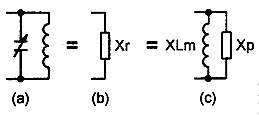Figure 2 - Shunt tuning equivalent. (a) Tuning capacitor and primary coil in parallel = (b) Resultant shunt reactance (one component) = (c) Xr split into two components (refer Fig 3). |