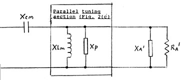 Before proceeding further into the main point of our discussion, we will clarify what happens to shunt component Xa' connected across our L match network. First look at Figure 2. In 2 (a), we have our Z match coil primary winding with a tuning capacitor connected across it. Combining these two elements we have a single reactance 2 (b) which can be set over quite a wide range by adjusting the tuning capacitor. Let's split this into two imaginary reactances in parallel which we will call XLm and Xp (refer 2 (c)).