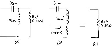 Having eliminated Xp and Xa', we now have the diagram Figure 4 (a) with parallel components XLm and Ra' in series with XCm. Making another conversion of the parallel components to series form, as shown in 4 (b), we get inductive reactance XLm' and resistance Ra" both now in series with XCm. We now see a series resonant circuit. The series reactance XCm is equal but opposite in sign to reactance XLm' leaving just resistive component Ra" (Figure 4 (c)) which is 50 ohms and the correct load for our transmitter.
