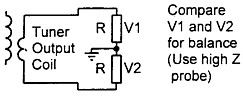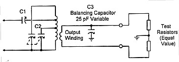 W6JJK describes a method of measurement to determine output circuit balance for a given load resistance. As shown in Figure 1, a resistor of half the load resistance value is connected from each balanced output leg to ground. RF power is fed into the tuner which is set up for a correct match into the resistance load. The voltage is measured across each leg to ground using a high impedance probe. The ratio between the two readings is a measure of the degree of balance. |